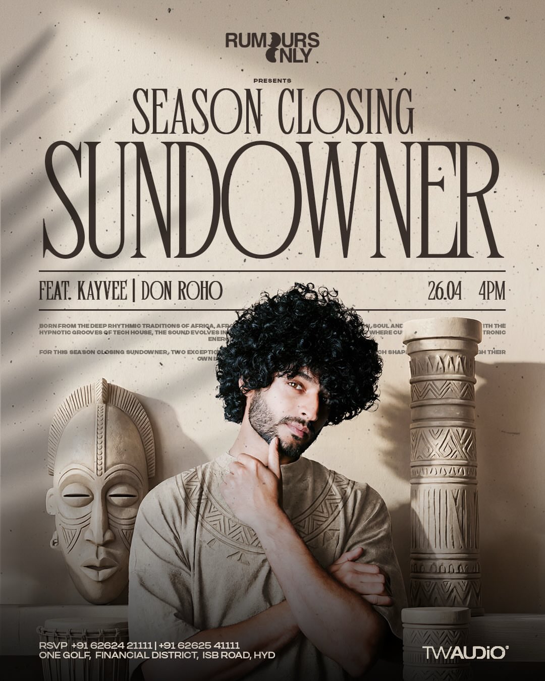 Hyderabad, the season closes. Kayvee Music — the city's own — joins forces with Don Roho, a rising tech house force shaping the new wave. Afro rhythms. Hypnotic grooves. A dancefloor that moves as one. This is where the tribe gathers one final time before the silence.
